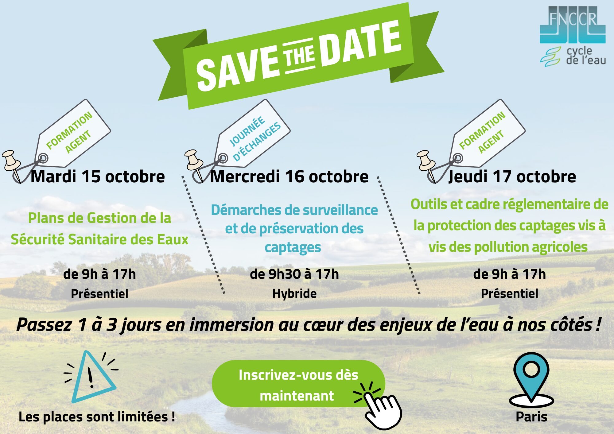 Cette journée se verra encadrée par deux formations aux thématiques liées tels que les Plans de Gestion de la Sécurité Sanitaire des Eaux (PGSSE) dont la formation aura lieu le mardi 15 octobre 2024 et les outils et cadre réglementaire de la protection des captages vis à vis des pollutions agricoles qui seront abordés lors de la formation du jeudi 17 octobre 2024.