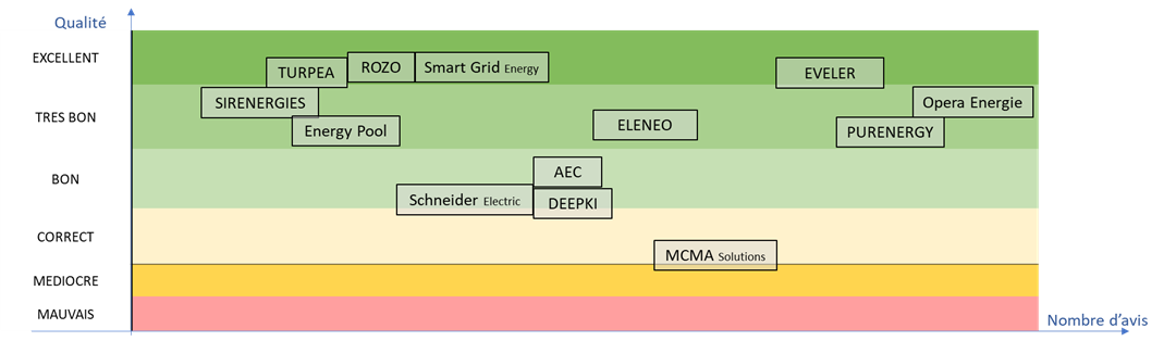 Les grands consommateurs sont également interrogés sur la qualité des prestataires de service auxquels ils font appel : accompagnement aux appels d’offres et aux prises de position (AMO), agrégateurs d’effacement, conseil fiscal, juridique, environnemental, outils de suivi des consommations… Les avis recueillis concernent 59 cabinets. Cependant le nombre élevé de sociétés de conseil fait que, pour beaucoup de prestataires, le nombre d’avis reçu par société n’est pas suffisamment représentatif pour être publié, ce qui ne fait apparaître que 13 prestataires au final.