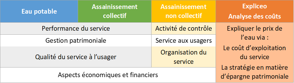 C’est pourquoi, en complément de l’analyse comparative, la FNCCR a créé pour les collectivités organisatrices Explicéo, un outil d’analyse détaillée des recettes et des coûts de leur services, selon une décomposition fonctionnelle. Elle repose sur des ratios techniques et économiques établis à partir des données des comptes administratifs des services et de ceux produits par les éventuels délégataires. Ils facilitent ainsi la compréhension des variables structurantes des coûts des services sur un territoire et des enjeux financiers et les comparaisons interservices permettant d’identifier des marges d’optimisation et contribuent à répondre l’exigence de transparence. Il vise ainsi à mettre en lumière les facteurs d’explication du prix de l’eau en dépassant la référence classique du prix de la facture d’eau pour une consommation type de 120 m3.